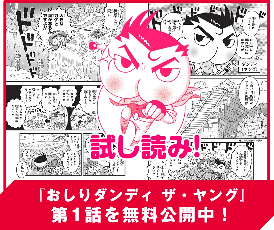 超人気児童書「おしりたんてい」とのコラボ漫画! おしりたんていの父・おしりダンディが、遺跡に隠された貴重なお宝を回収し保護するため世界中を飛び回る大冒険アドベンチャー!! おしりたんていが産まれる前のヤング時代(20歳くらい)のダンディに大注目!!